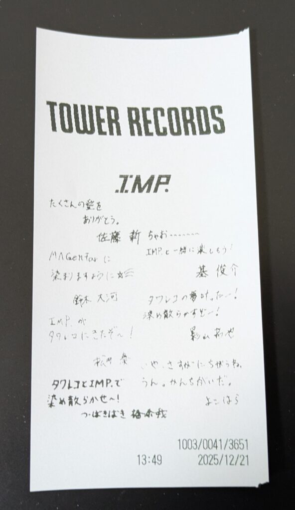 2025年12月15日に発売されました。IMP. 2nd Album 『MAGenter』初回生産限定盤Bをタワーレコード渋谷店で購入してきました(^^)/