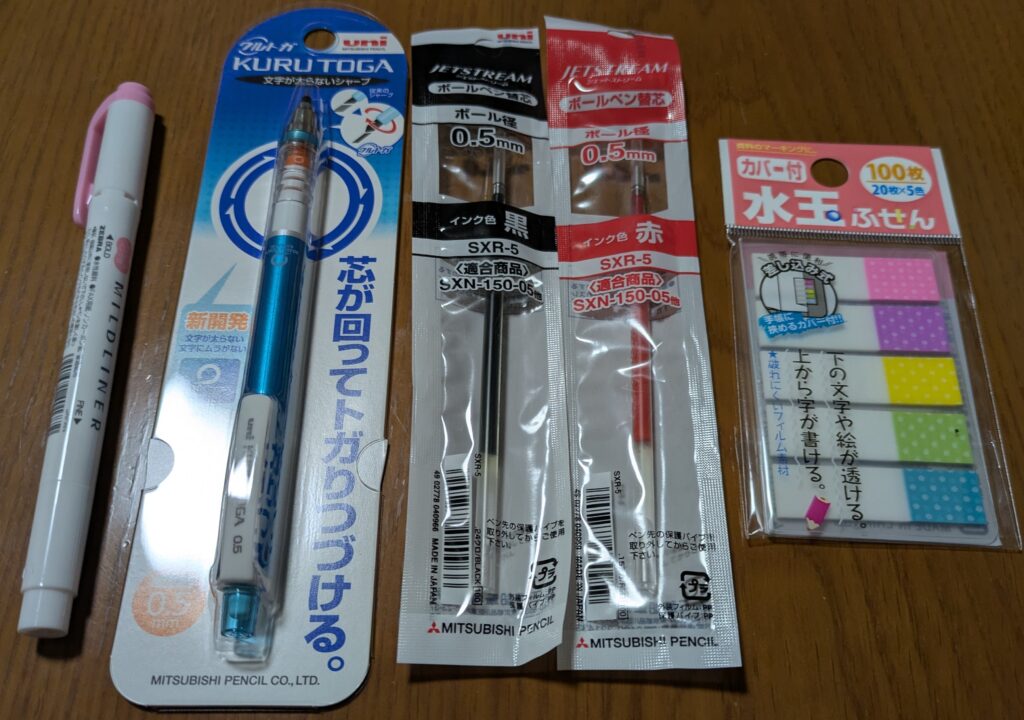 購入理由は愛用してるシャーペンの破損で買い替えたかったのとボールペン替芯とマーカーとふせんは補充でした(*^^*)