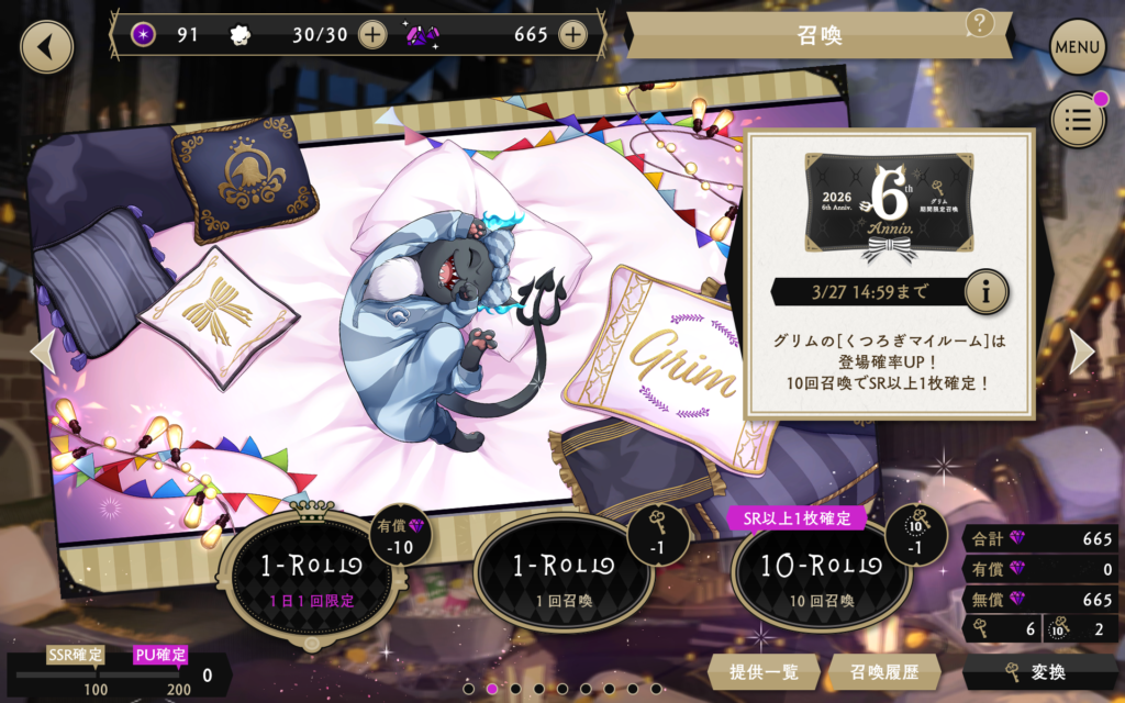 現在、「6thアニバーサリー 期間限定召喚 グリム[くつろぎマイルーム] ver.」が開催中です。